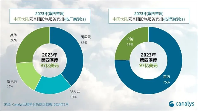我们持续关注了知名研究机构canalys一个时期以来发布的数据。根据2023年第四季度的数据,阿里云、华为云和腾讯云分别以38.9%、18.6%、16.3%的占比份额,占据了云服务总支出的73.7%,三家总市场占比接近四分之三。
